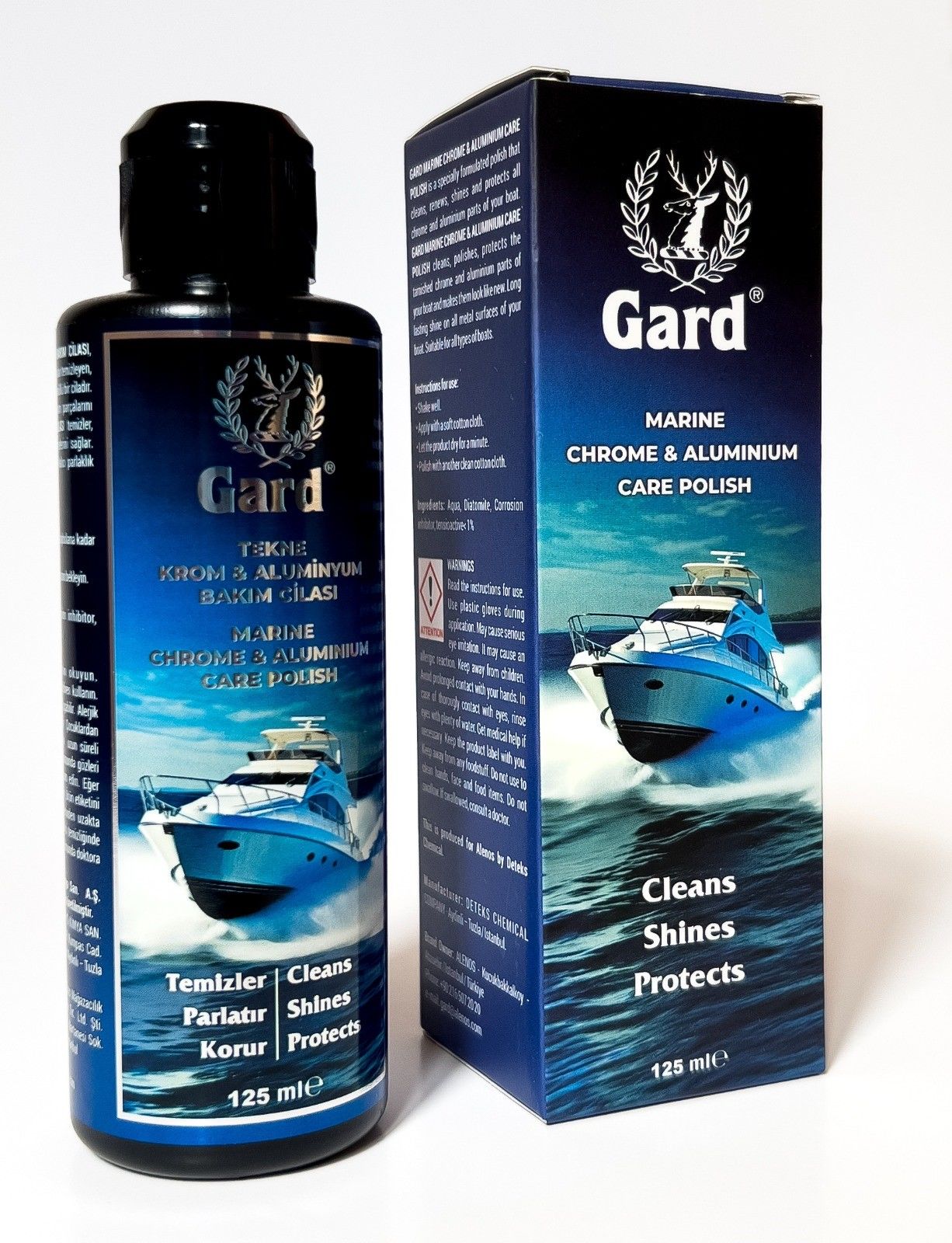 GARD TEKNE KROM & ALÜMİNYUM BAKIM CİLASI, teknedeki krom ve alüminyum tüm parçaları temizleyen, yenileyen, parlatan ve koruyan özel formüllü bir ciladır. Teknenizin kararan krom ve alüminyum parçalarını GARD KROM & ALÜMİNYUM BAKIM CİLASI temizler, parlatır, korur ve yeni gibi görünmelerini sağlar. Teknenizdeki tüm metal yüzeylerde kalıcı parlaklık sağlar. Her türlü tekne için uygundur.
